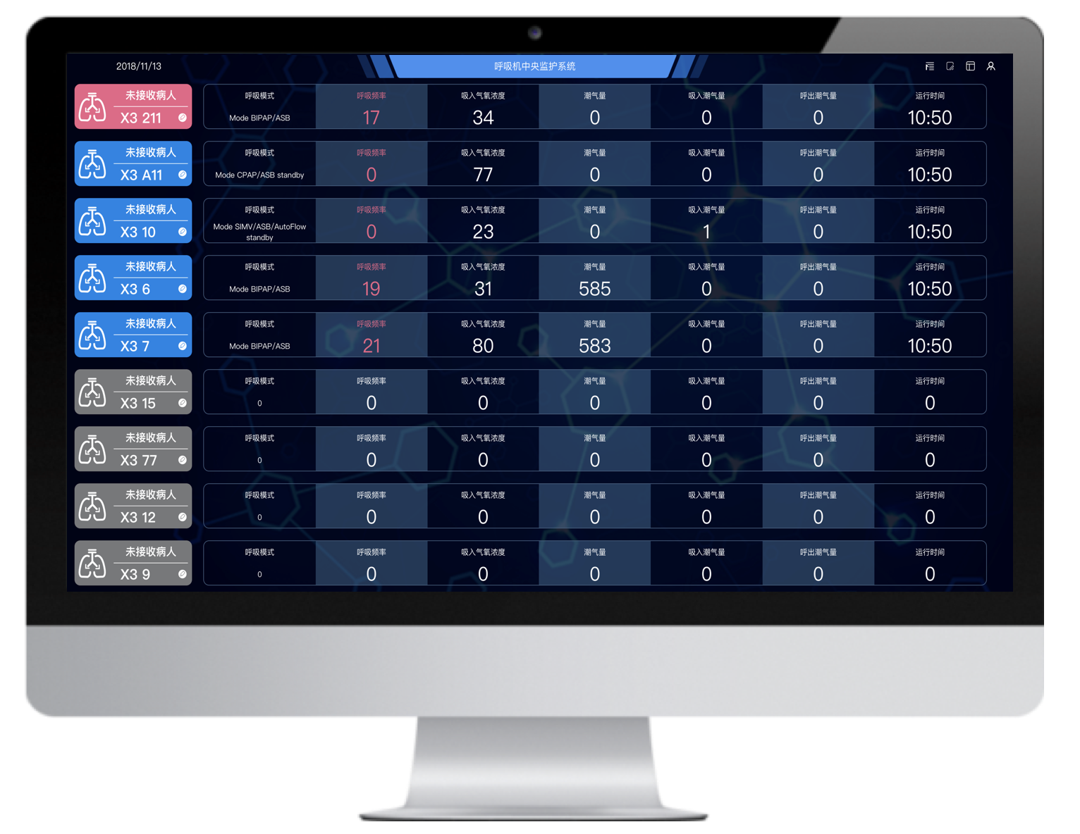 多臺(tái)不同品牌的有創(chuàng)呼吸機(jī)聯(lián)網(wǎng),并通過大屏實(shí)時(shí)集中呈現(xiàn)治療預(yù)設(shè)參數(shù)和監(jiān)測參數(shù),實(shí)現(xiàn)多臺(tái)集中監(jiān)測、集中管理和數(shù)據(jù)存儲(chǔ)。